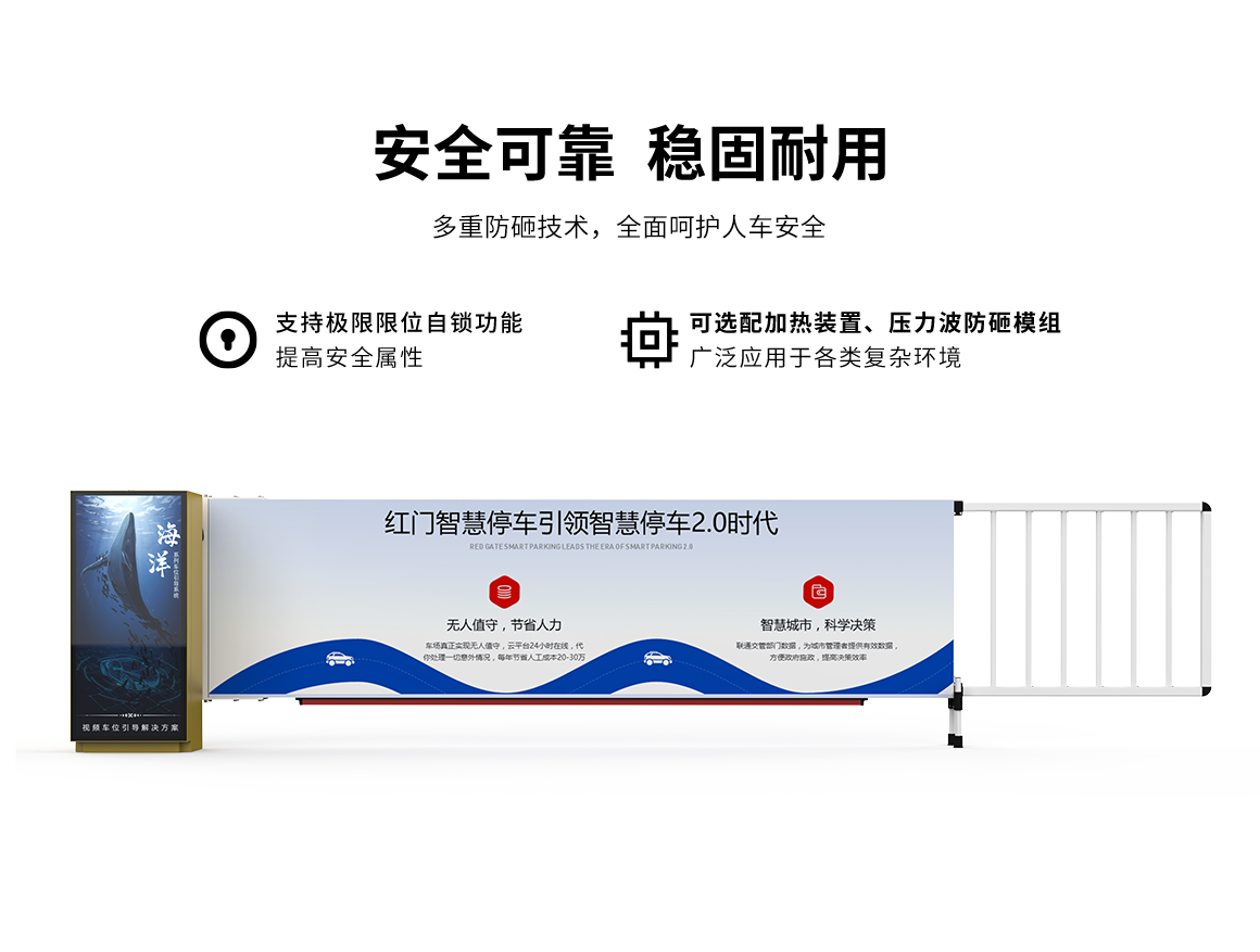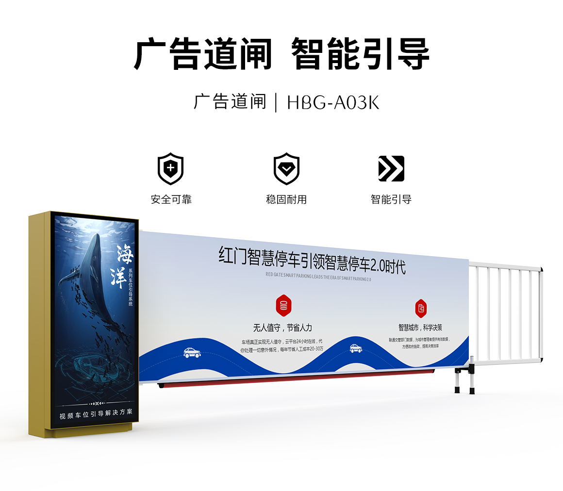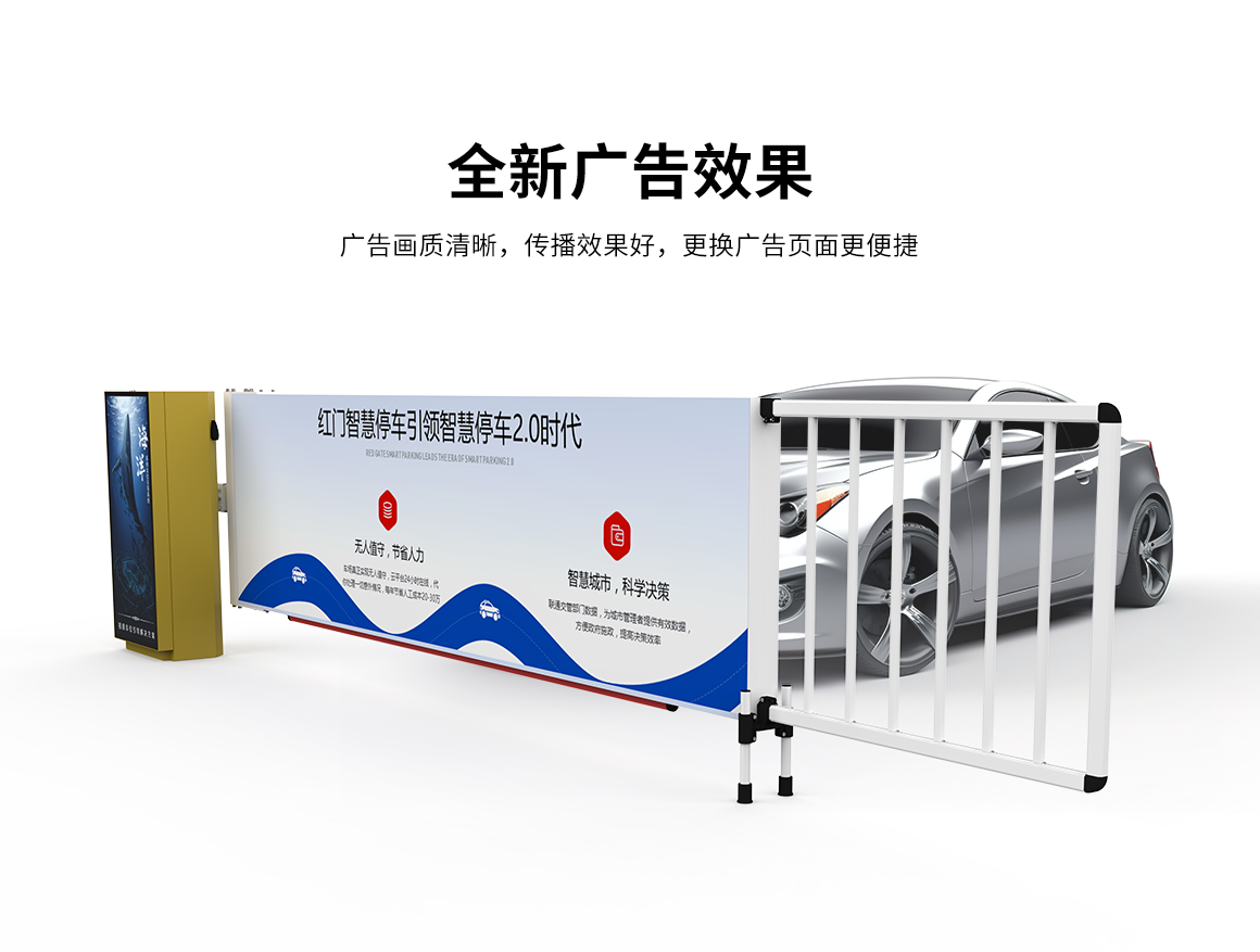 卡布广告道闸(HAB-A03K),道闸与广告相结合,具有全新广告效果,广告画质清晰,传播效果好,更换广告页面更便捷,是传媒投放广告的新方向,并可根据现场净洞宽调整门排长度,采用伺服机芯驱动,更广泛应用于各类场景。