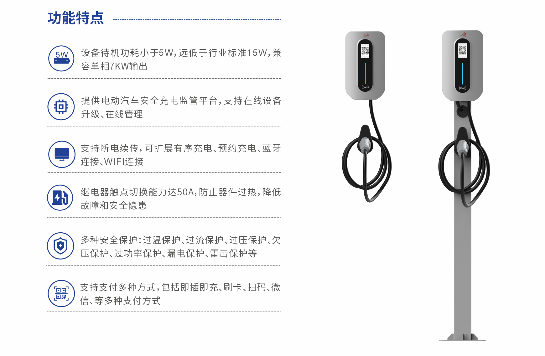 7KW钣金款交流充电桩LCD版本,分为单枪和双枪,搭配4.3寸触摸显示屏,具有操作简单、满功率充电智能化程度高,外观设计新颖、体积小、材质重量轻,智能化充电设备,采用数字化、智能化控制技术,让电动汽车充电安全可靠。集功能与美学于一体,线条明亮简明,钣金镀锌,抗腐蚀抗氧化,使用寿命长,充电过程实时监控,数据实时监控和上报运营平台监管。